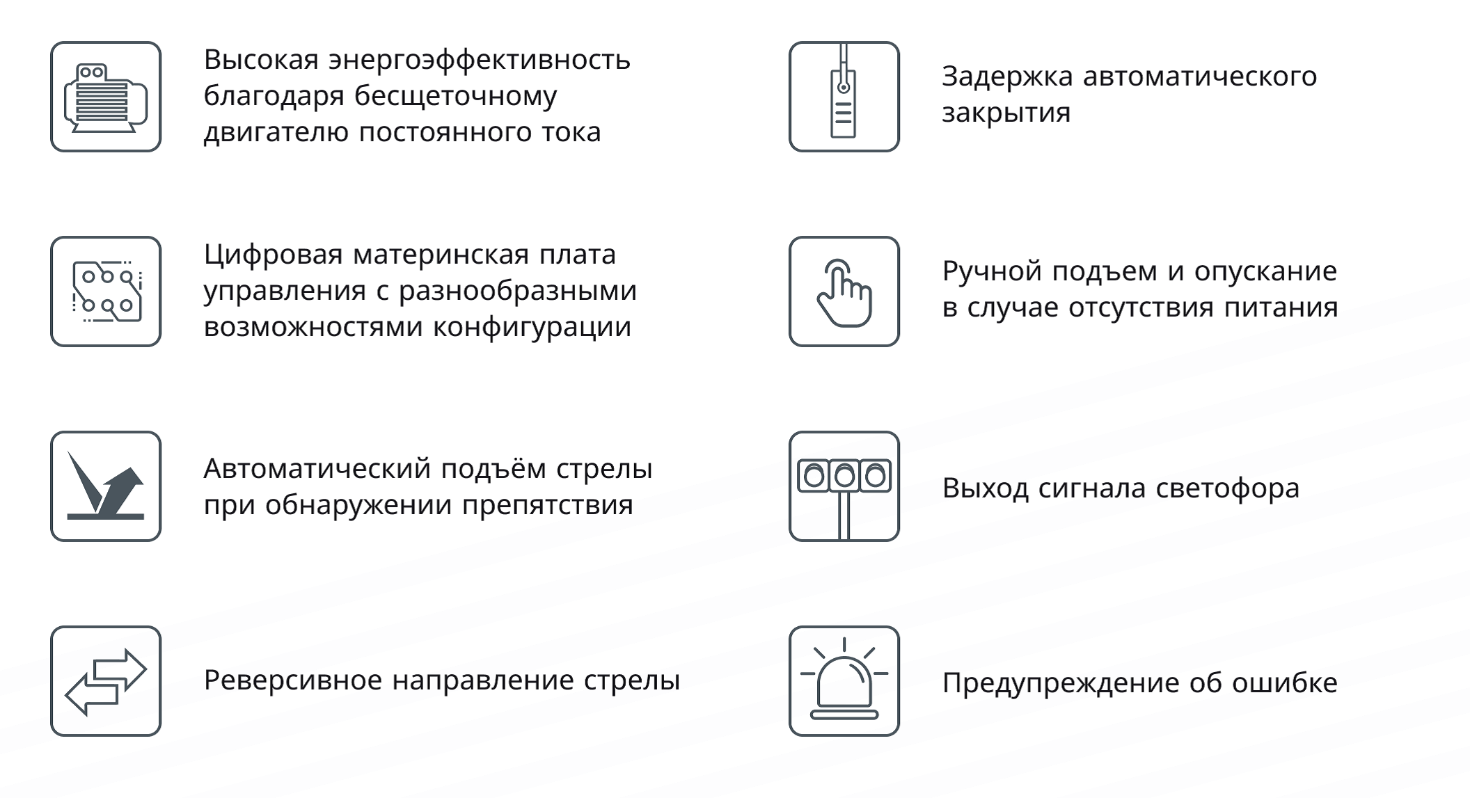 - Поддерживает автоматическое отключение питания, ручной подъем стрелы, интеграцию с пожарной и охранной системой.