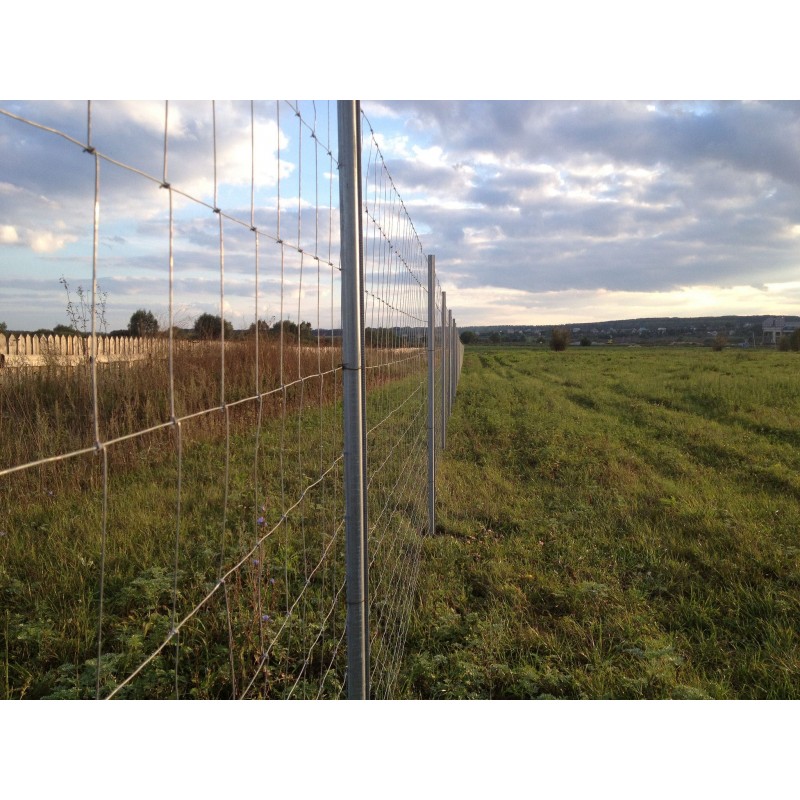 Диаметр верхней и нижней проволоки натяжения 2,5 мм, диаметр горизонтальной и вертикальной проволоки 1,8мм. Высота сетки – от 1 до 2,5 метров. Ячейка, прогрессирующая от 89мм до 203 мм. Первоклассное качество и прочность сетки дает возможность устанавливать столбы с шагом от 4 до 8 метров.